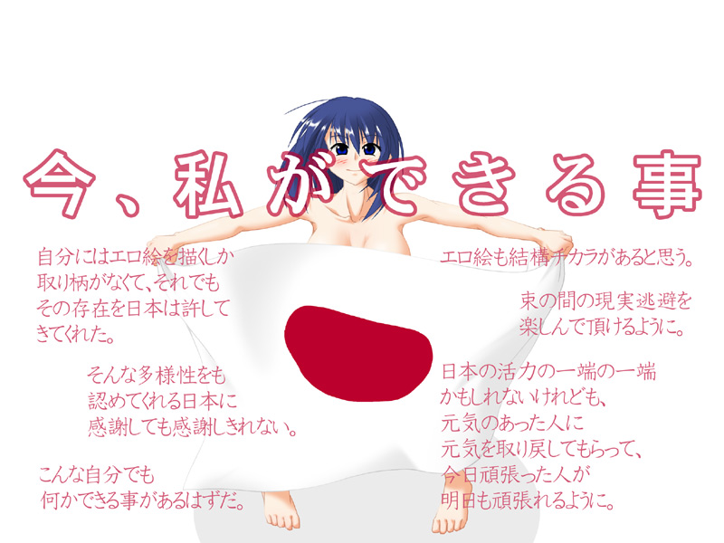東日本大震災で被災された方や、それに携わられている救援の方々が元気になってもらえるような作品をあげていきたいと思います。そして、この震災が時間が過ぎ行く中で忘れない為に・・・。 (ご協力頂きましたクリエイターの皆様、ありがとう御座いますm(_ _)m)